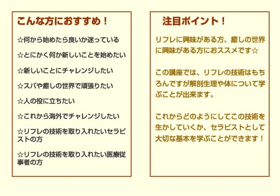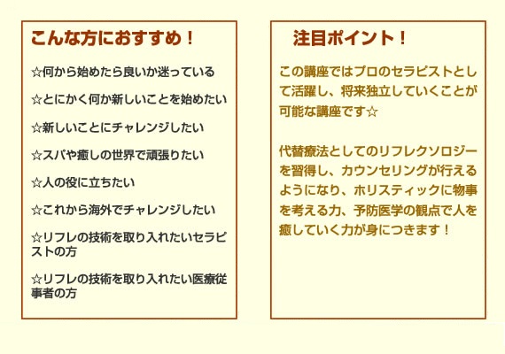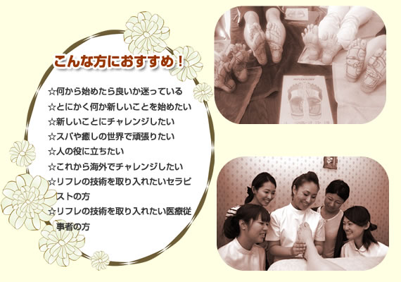 フェイシャル・ヘッド・ボディートリートメントリフレクソロジー以外の技術習得しメニューのバラエティーを広げる事ができ、サロン開業やスキルアップ、サロン就職の際に有利です。