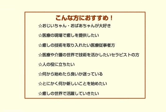 医療や介護・福祉の現場(または同義の環境)において、医師本人、又は医師の指導・監督のもと、介護予防ボディートリートメントを行う技能を有し、専用のベッドを使用せず行う身体の各部分(全身)へのトリートメント技術を身につけます。